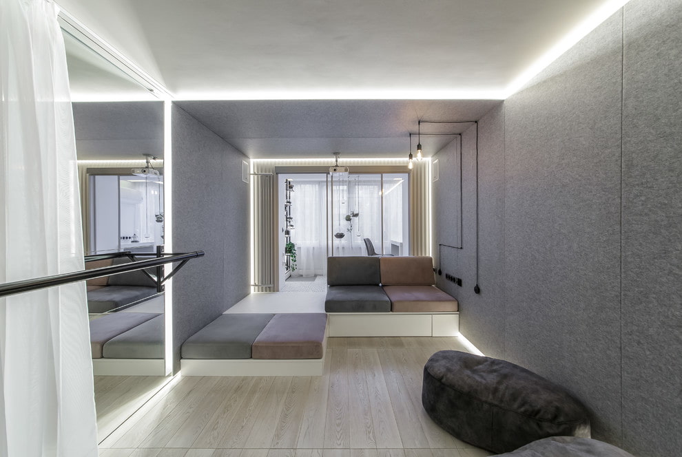 The mirror panel unusually reflects light rays, thereby visually increasing the space, and making the interior original and modern. Such a non-standard design solution adds an impeccable sense of style to the living room.
