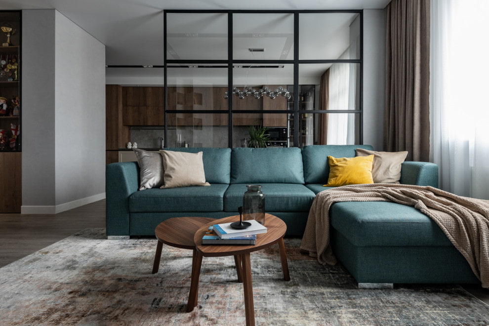 The most expensive and relevant material for dividing the living room today is glass. Transparent partitions gently demarcate the space, reflecting light and visually enlarging the room.