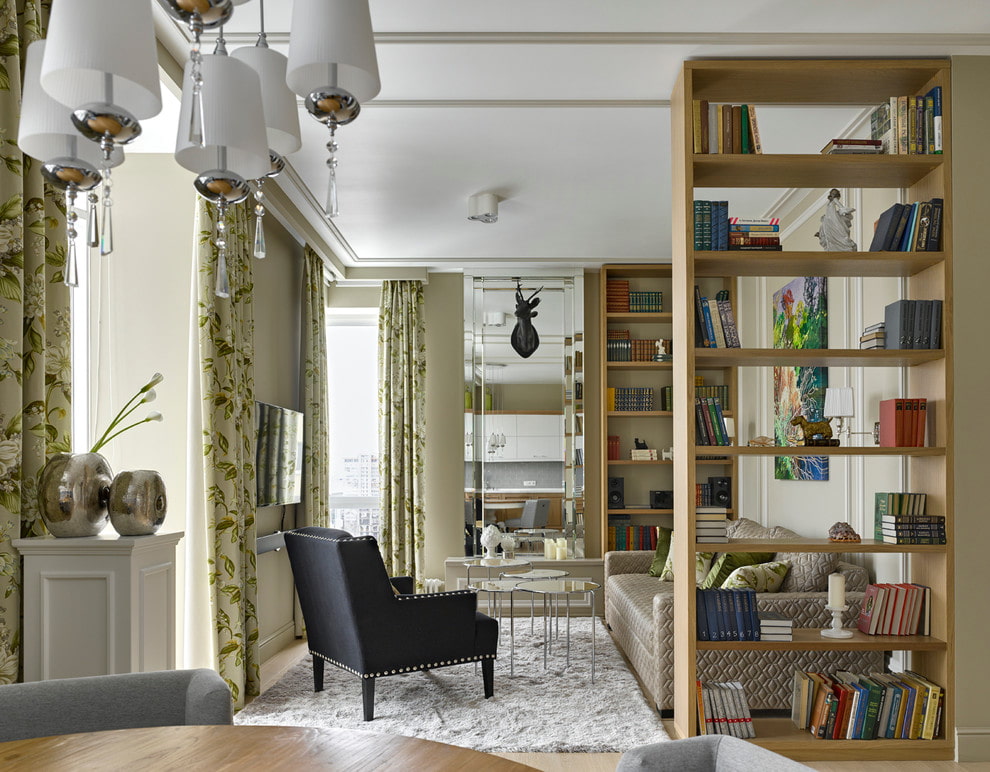 Delineate the room with a lung shelving - a typical way in domestic interiors. Products from metal, wood, laminated chipboard and MDF are used.The rack not only zoning the living room, but also acts as a place to store books, photographs, flower vases and decor. Popular option - shelves decorated with home plants in pots.