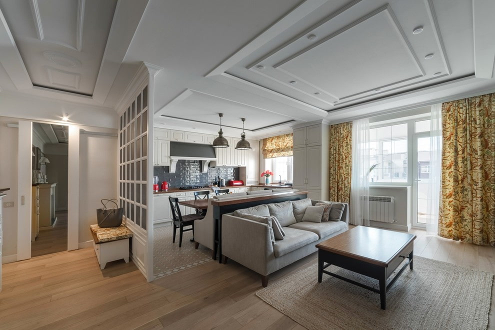 The opposite option to the podium is to delimit the room with the help of a ceiling. This solution allows you to visually divide the living room and lay additional communications inside. You can use both tension canvases and hinged structures made of plasterboard.