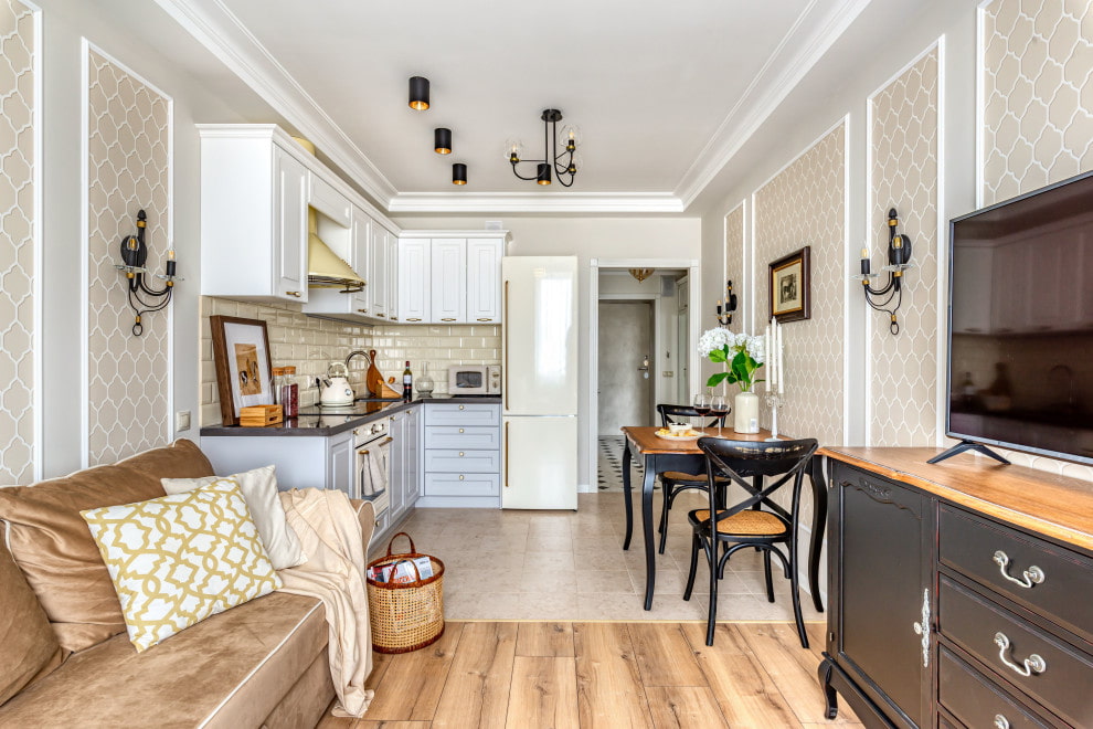 If the kitchen and living room are located in the same room, you can draw the border between the areas using different flooring: it is more appropriate to lay in the cooking area ceramic tiles, and in the residential part - parquet, laminate or linoleum.
