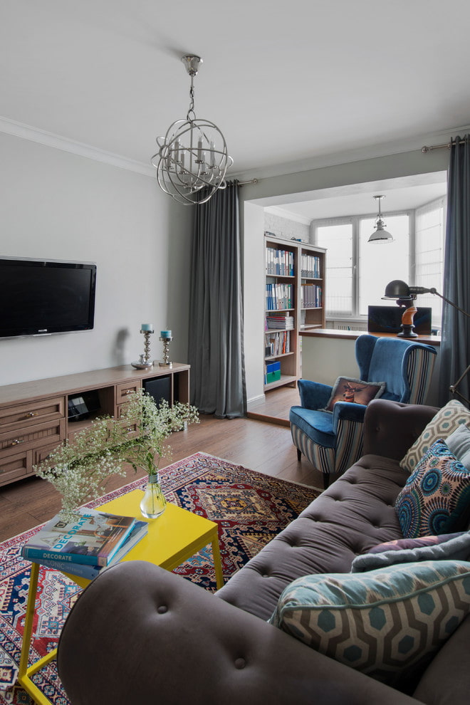 To achieve the best result, it is worth adding a carpet to one of the areas. In combination with light, it will allow you to divide the room at a very low cost.