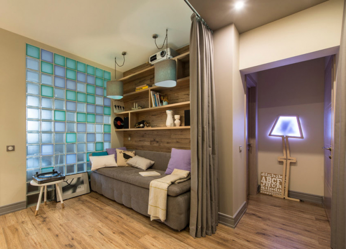 In order not to overload the room with furniture, use a cloth. Curtains - a budget and practical option: they are mounted by installing cornices, they are easy to change and easy to care for. Curtains are able to separate the sleeping area, creating an atmosphere of privacy with one movement of the hand.