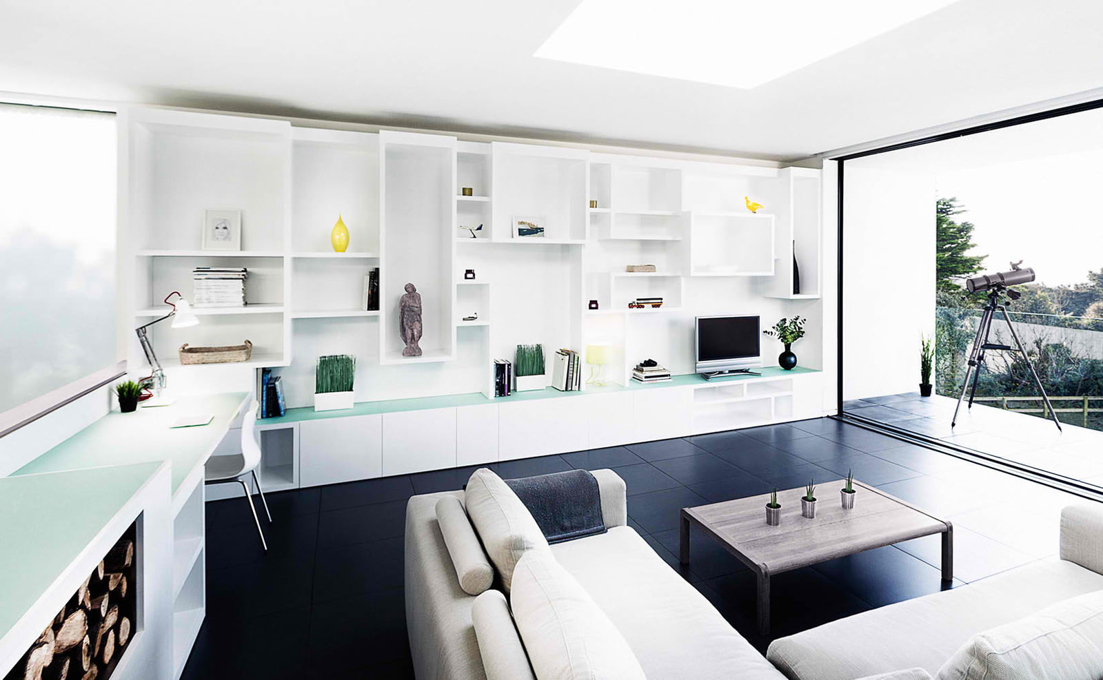 Sometimes the home office is raised above the living room level with a specially built podium, the volume under which can be used to store seasonal items, such as skis or seitboards.
