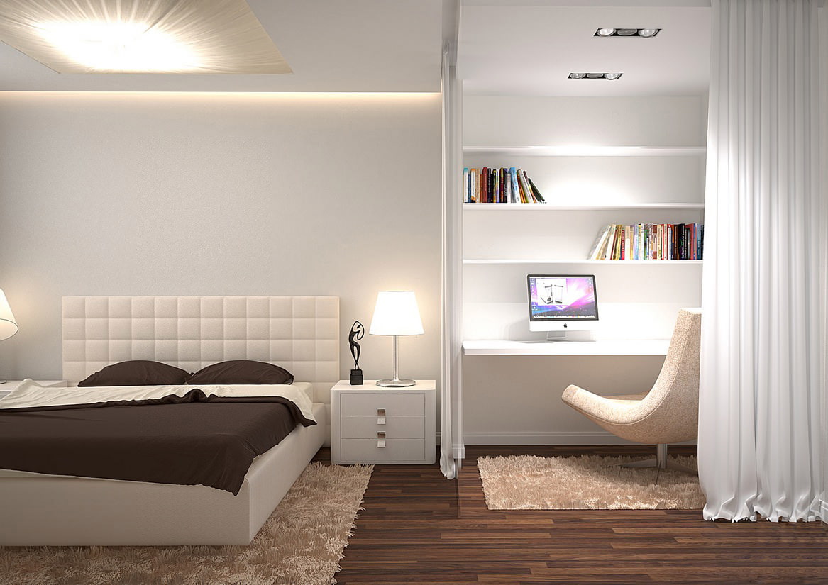 A much more suitable option might be to place cabinet in the bedroom... During the daytime, this room is usually deserted, and nothing will distract from work. The bedroom room should be divided into two functional areas: the sleeping area itself and the area where the workplace will be located.