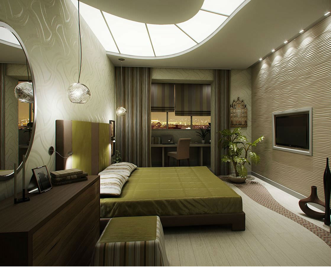 Cabinet design in the bedroom may be the same, or may contrast with the design of the sleeping area. It is possible to separate these zones from one another using partitions, or using various finishing materials on the floor, walls, and ceiling. You can divide the zones with both light and color.