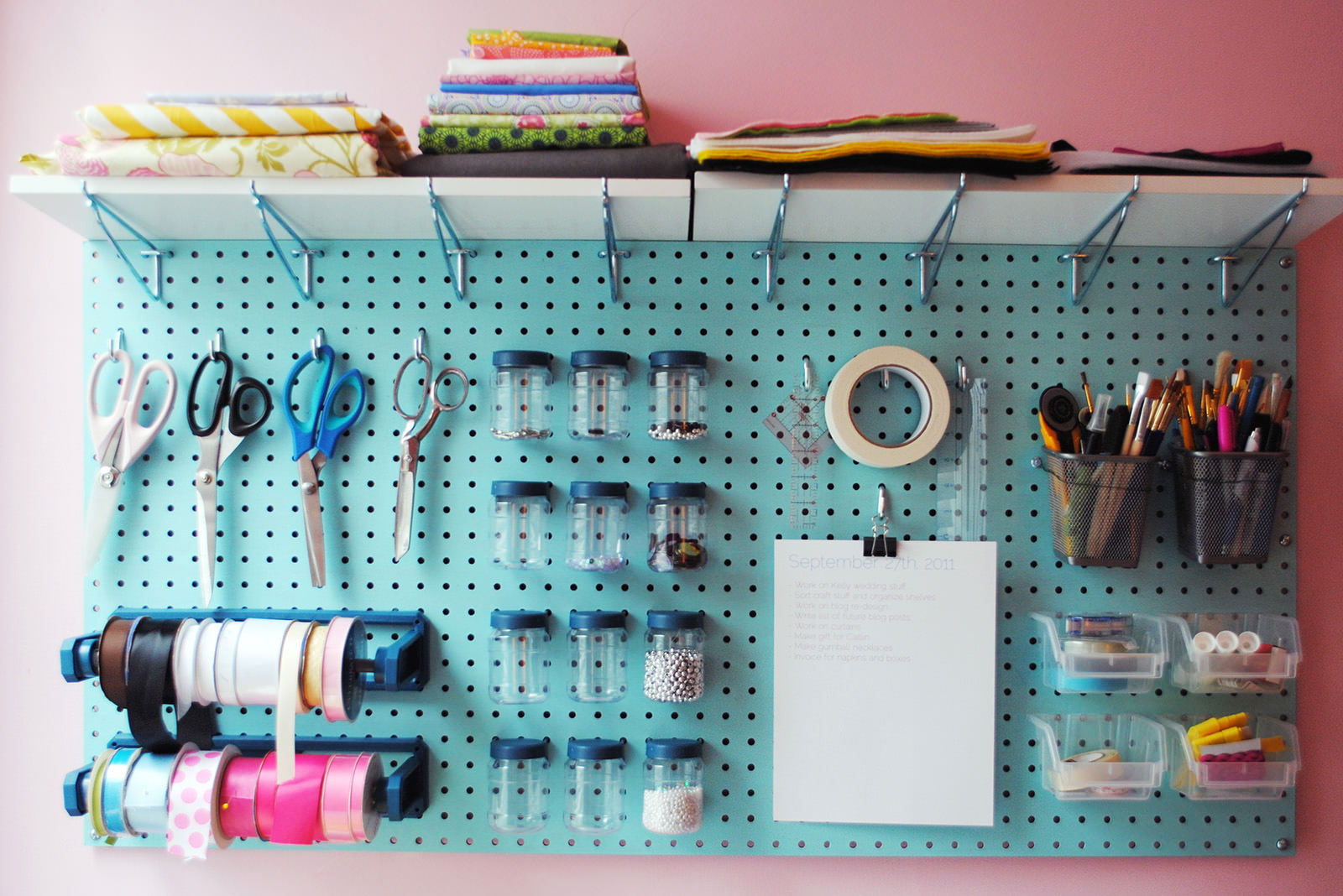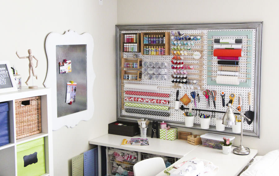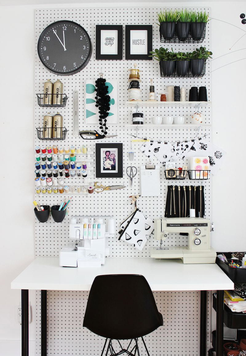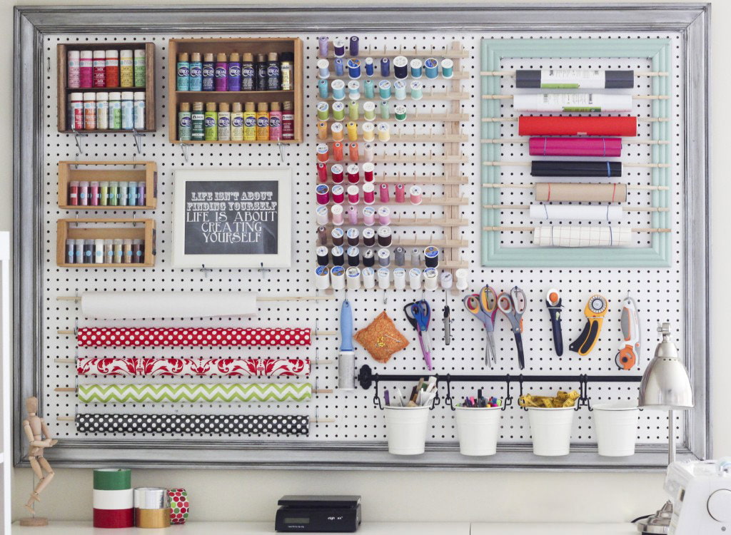 An excellent solution for wall storage is a metal grill. On such a board, using hooks and rails, you can arrange any items for needlework.