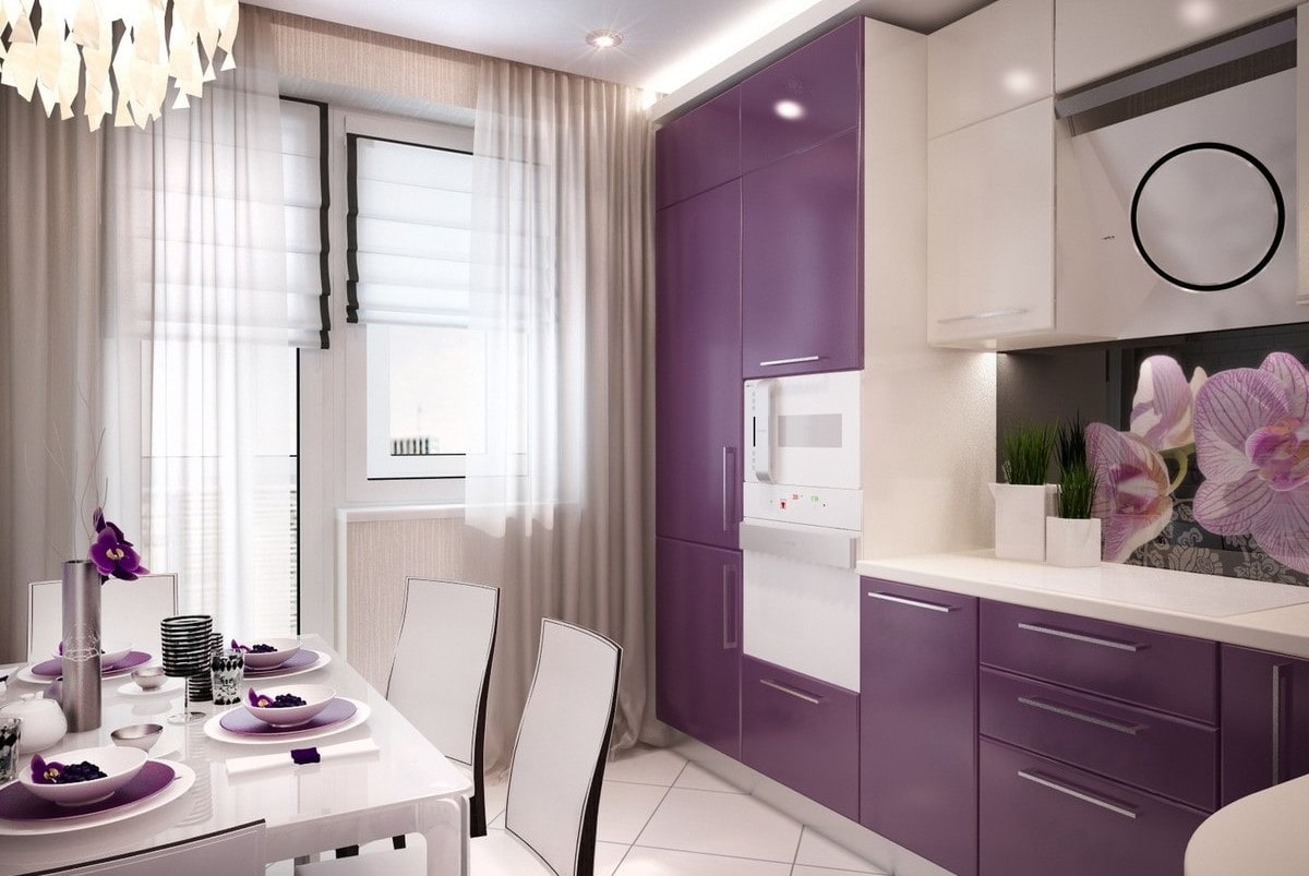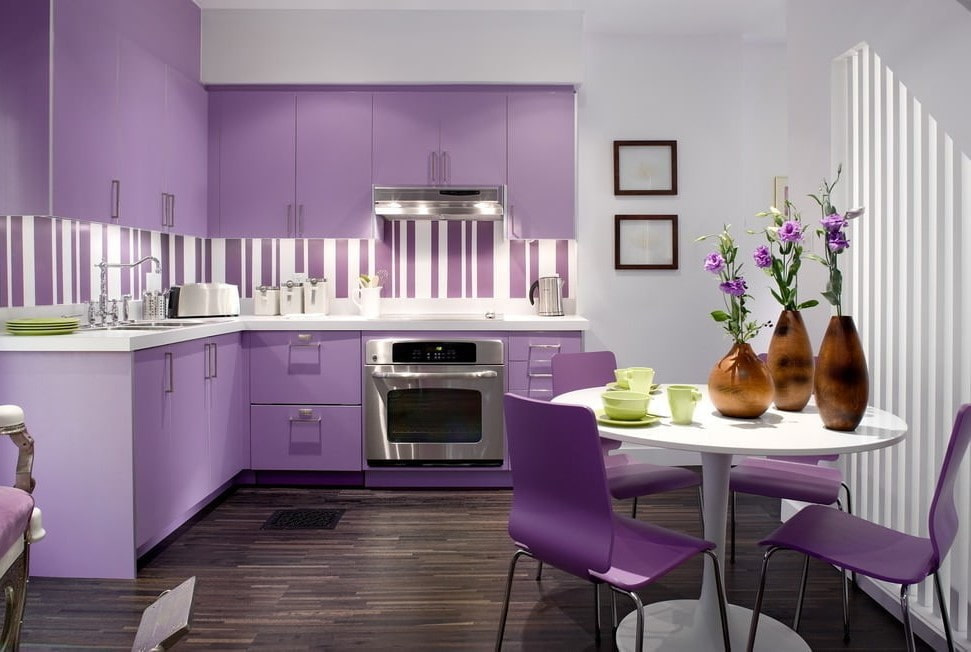 The kitchen set should be as laconic as possible without pretentious decor elements. For a dining table, chairs, countertop or apron, lilac or purple colors are appropriate.