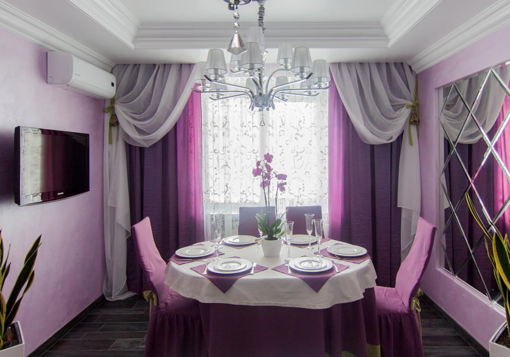 An extraordinary design idea is curtains or blinds in orange, red, yellow or pink. For a lilac interior, it is better to choose canvases made of iridescent silk fabric, which will overlap with stools on chairs, a tablecloth or other textiles. Organza curtains with unobtrusive performance and light play of color look no less impressive.