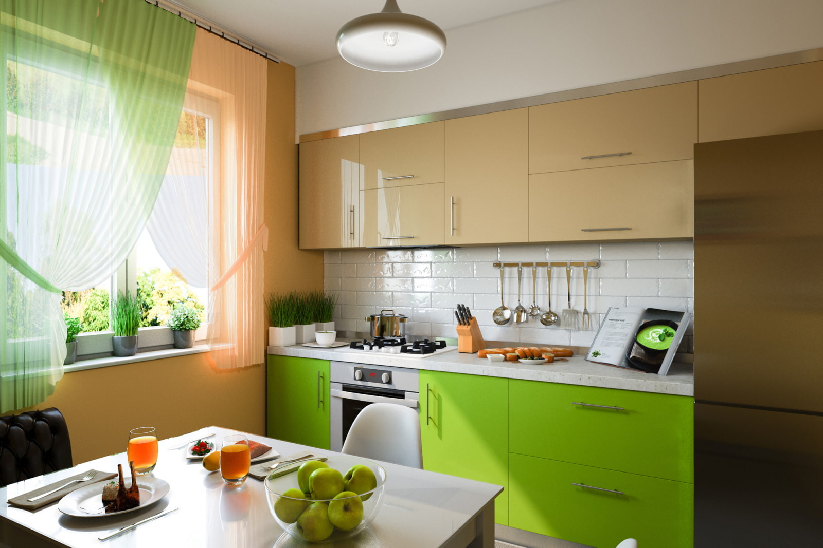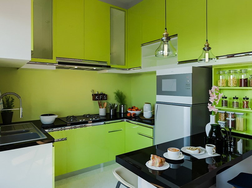 Clean and fresh light green color fills the room with air and makes it much more spacious. Therefore, these shades are especially suitable for the design of a small kitchen. A truly relaxing atmosphere in the room will form a pleasant pistachio, light green or apple color.