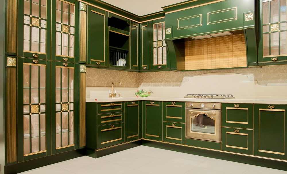 For a classic style, they prefer deep and noble dark green or swamp colors. This design is complemented by accents in the form of glass fronts, gilded fittings, crystal vases, lamps with graceful lampshades and heavy draped fabrics.