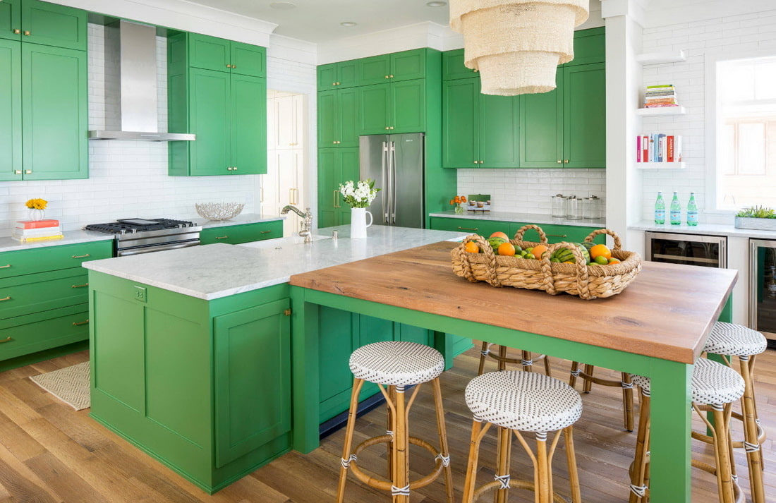 They will fill the kitchen space with a joyful mood and bring additional energy and cheerfulness into the environment. Poisonous greens, limes, neon greens and other bright shades will ideally fit into a modern style with a geometric and slightly austere design.