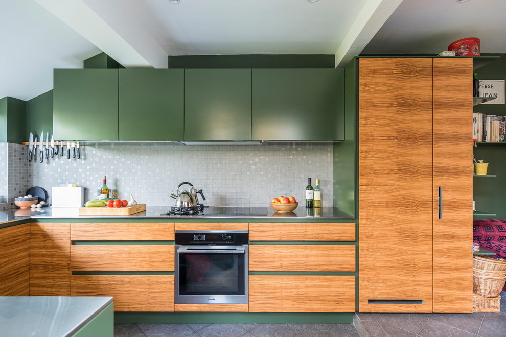 In the photo, the design of the kitchen, sustained in light gray and dark green colors.