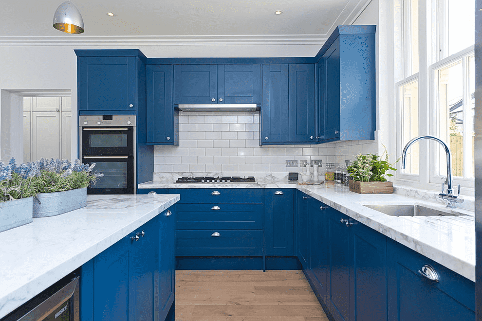 The photo shows the interior of a blue and white beige kitchen, decorated in a classic style.