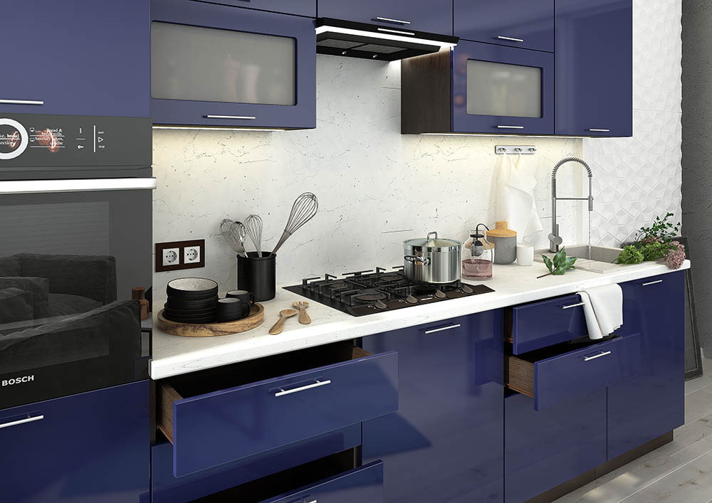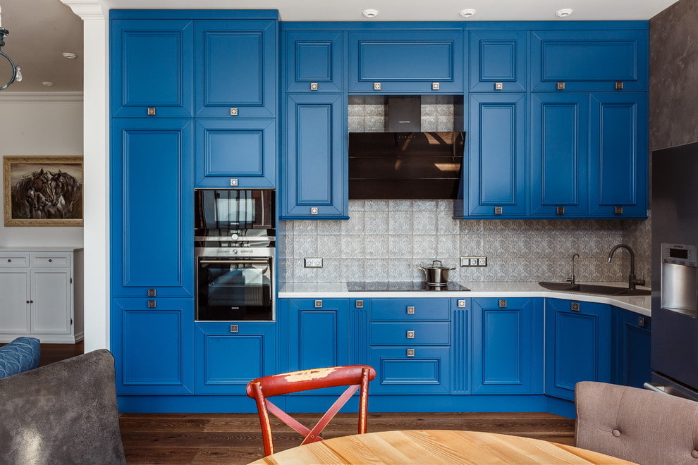 Restrained, muted, matte classic kitchen design, has strict lines and cold shine of metal fittings. Cool cobalt, azure or dusty blue shades are suitable for this style. Furniture fronts, complemented by panels, silver or gold handles, give the interior a presentable look.