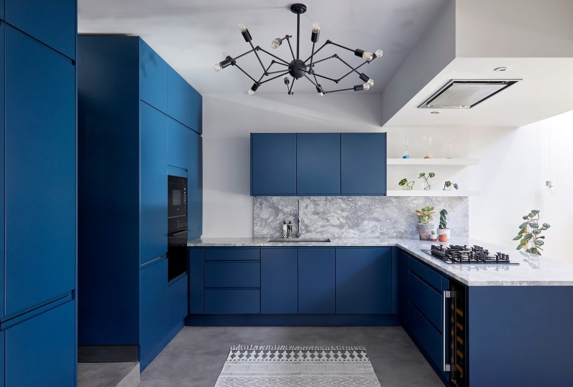 In the photo, a kitchen design with a dark blue suite in combination with gray walls.