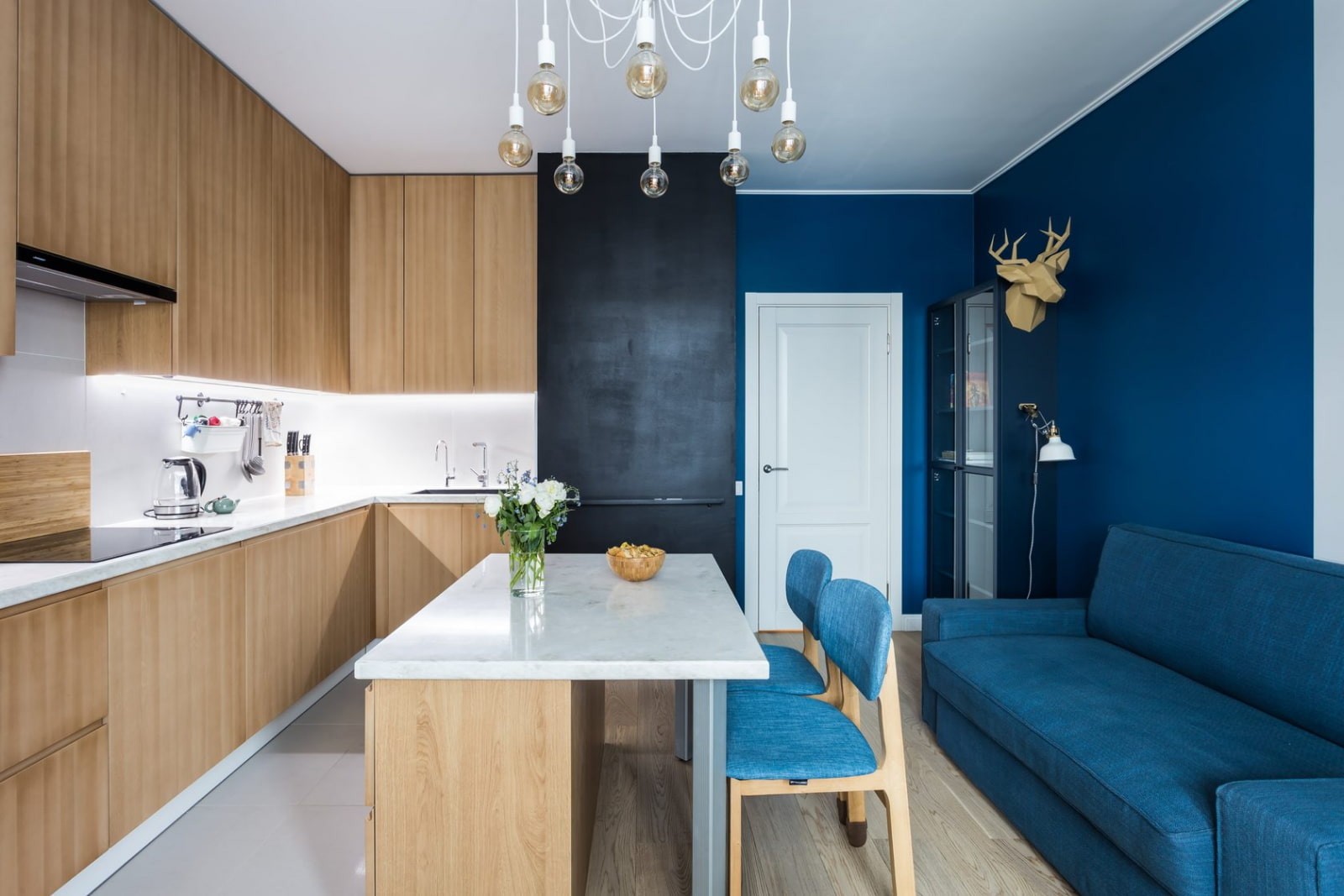 An interesting visual effect will be achieved by blue chairs, which are most often combined with lamps, a work apron or headset facades. An even warmer, more relaxed and at the same time original design can be achieved with the help of a sofa in dark blue, yellow, coral or white.