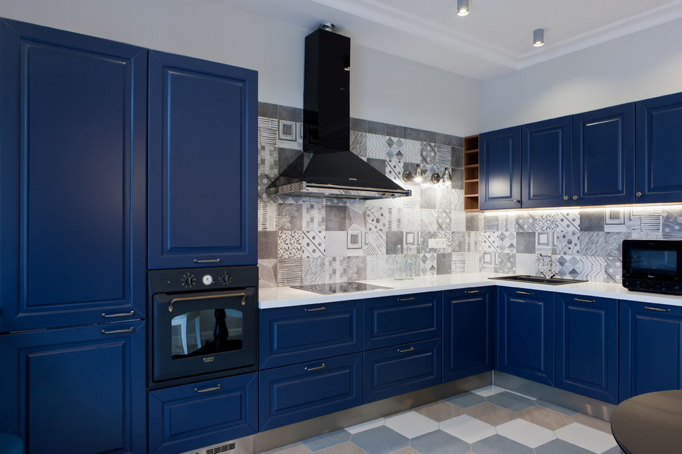 A kitchen in blue tones goes well with household appliances that have a metal surface. You can not hide the refrigerator and microwave behind the facades of the headset. When decorating a room in gray-blue shades, it is appropriate to install a stainless steel hood.