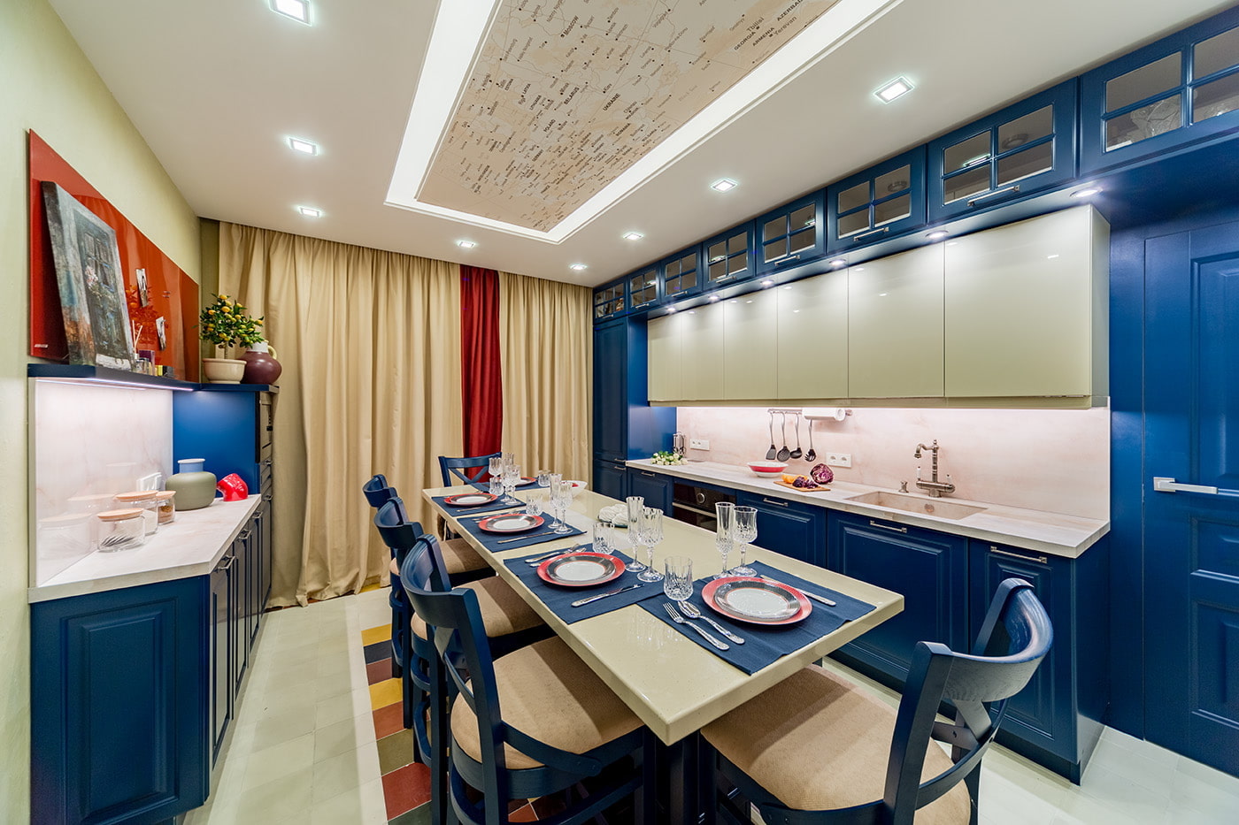 For decorating neoclassicism, it is possible to use deeper dark blue tones, which are diluted with gray, white, caramel or blue colors. With enough space in the kitchen, the location of a large round table and medallion chairs is appropriate.