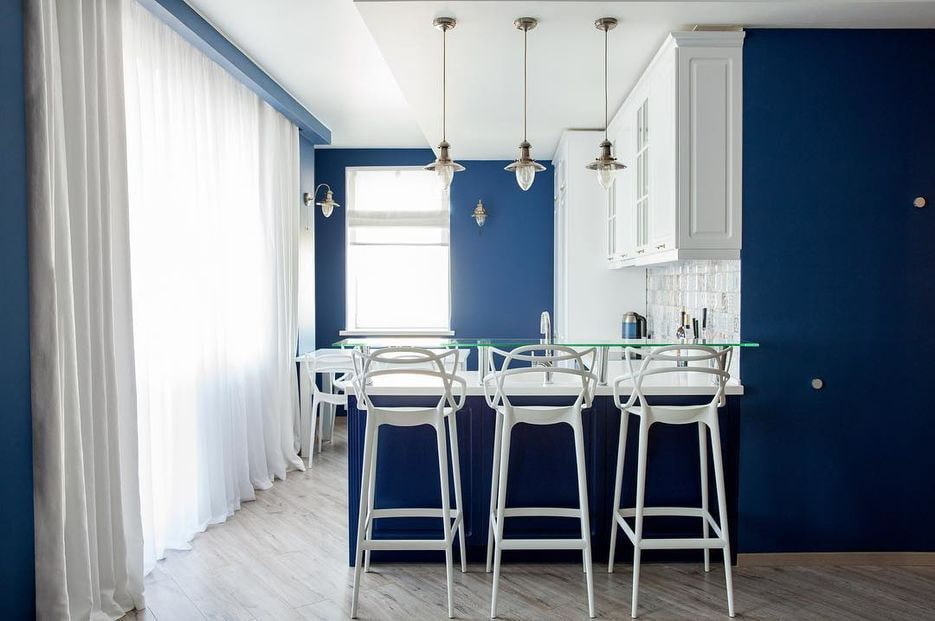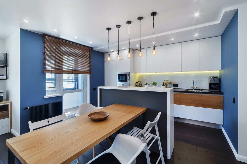 In the photo there are pendant ceiling lamps in the interior of the kitchen in blue shades.