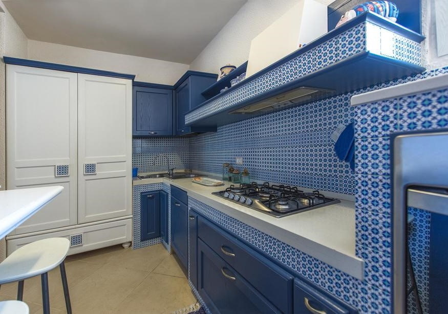 In Provence, there are mainly azure, turquoise and cornflower blue tones that are in harmony with aged wood furnishings, stonework and hand-made decor. The apron area is usually decorated with patchwork tiles or laid out with mosaics.