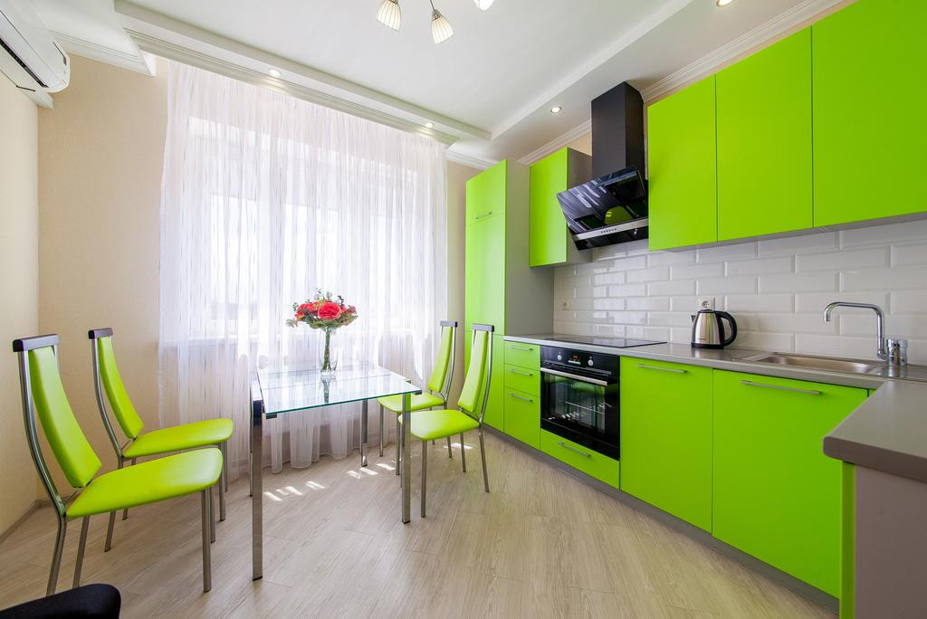 In the photo there is a lime-shade corner kitchen, complemented by wenge-colored wooden furniture.