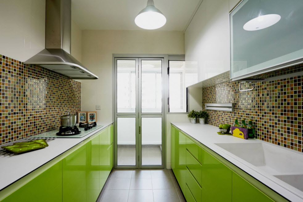 In the photo, a light green set with an apron decorated with mosaic tiles in the interior of the kitchen.