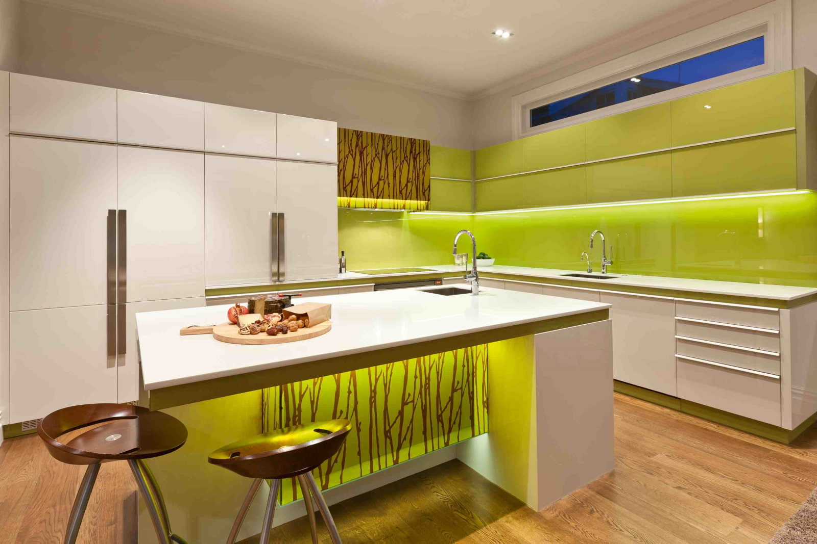 Glossy facades and natural finishes are welcome in a modern style. For such a holistic and stylish design, a fragmentary use of light green will be enough. For example, it can be bright photo wallpaper, a tabletop or an original apron.