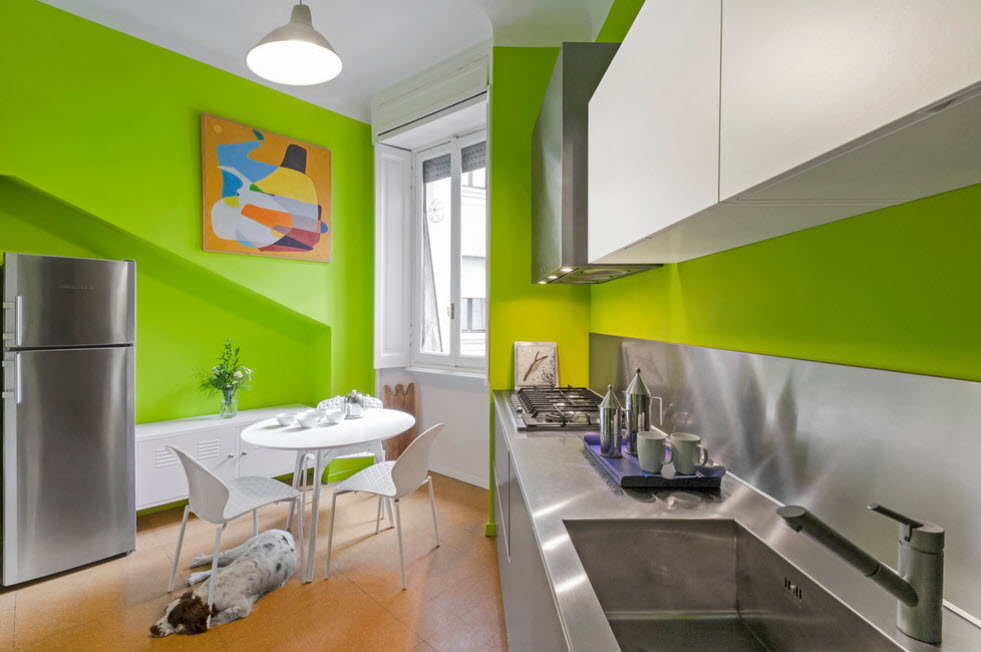 On a salad background, snow-white furniture items, light or silver household appliances will look especially harmonious.