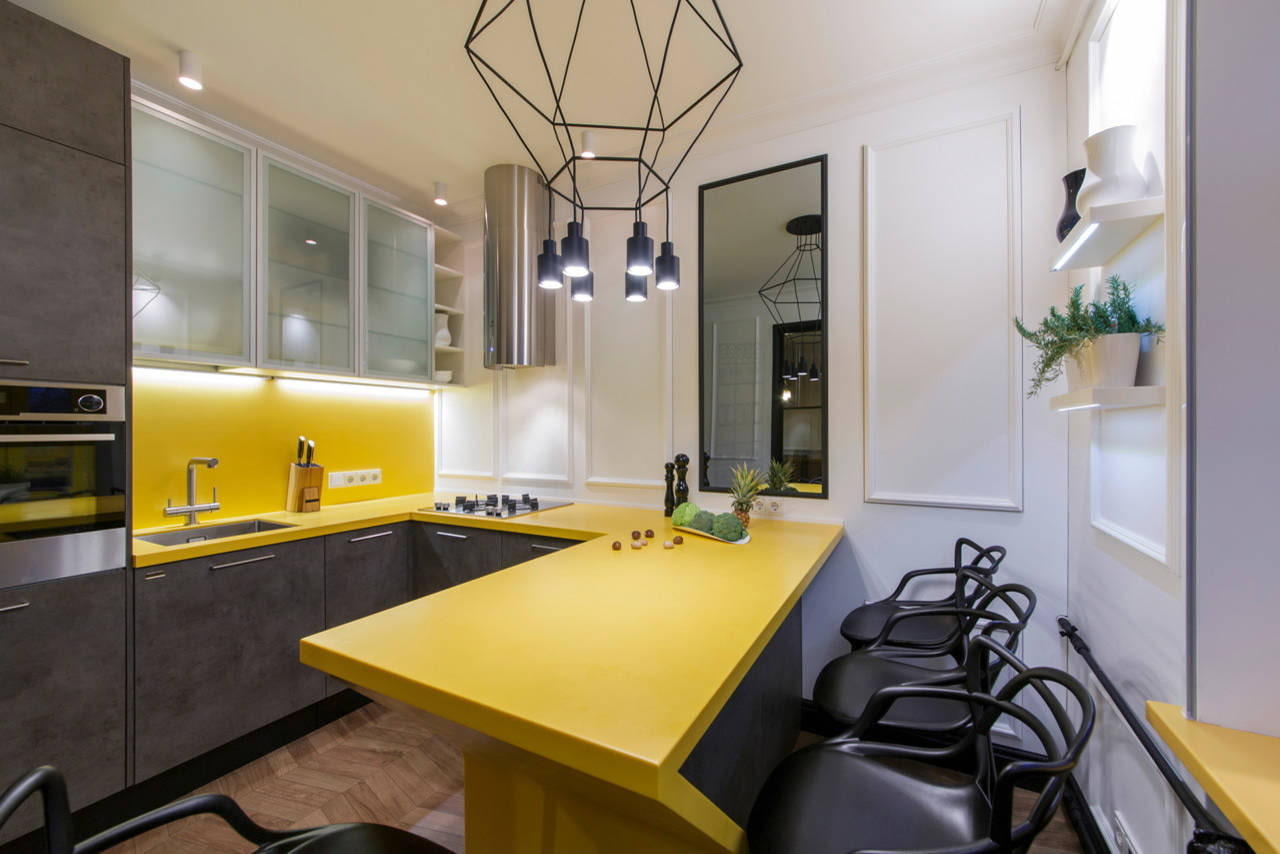 The photo shows a small kitchen with a gray bottom, yellow countertop and an apron. A rich color for a small kitchen is a great way to distract attention from its size.