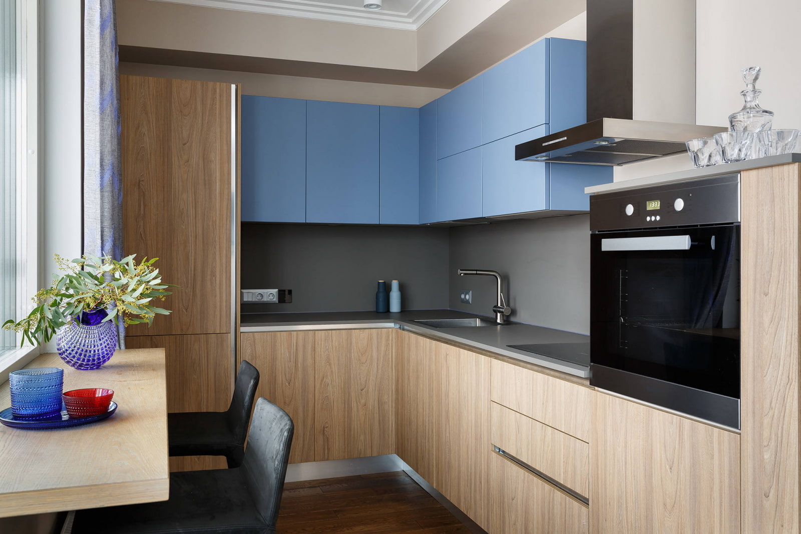 Recently, designers love to combine light wood with blue, pink and mint hues. They do not overload the space and play favorably on a combination of natural materials with delicate tones.
