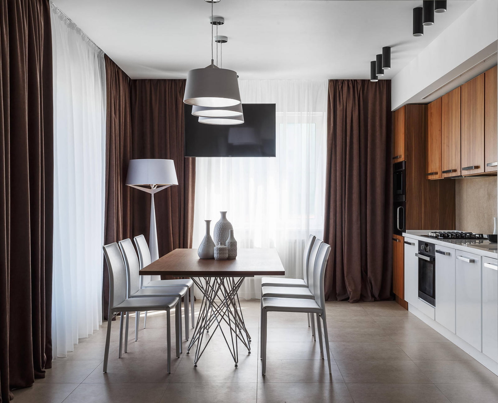 Pictured is the perfect Feng Shui cuisine - in pastel and woody shades with bright accents in the form of curtains.