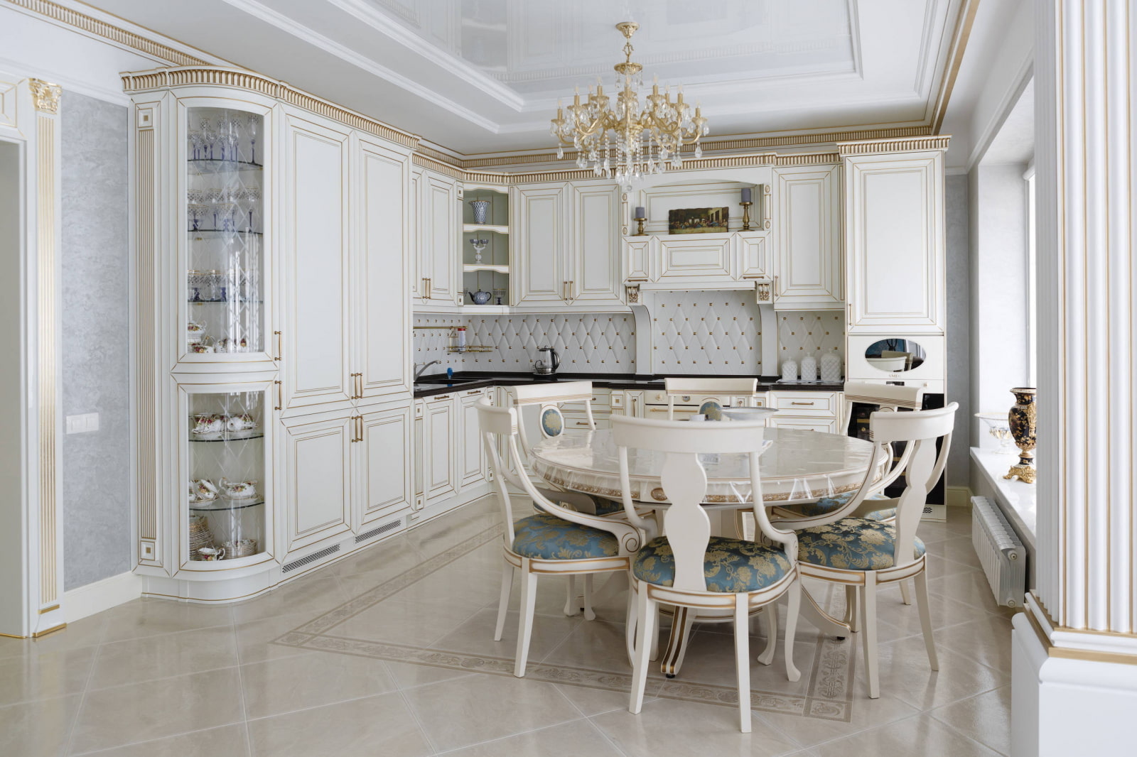 White still dominates in many countries. In spacious kitchens, both glossy and matte facades are used. To add warmth to the interior, designers advise adding wooden elements: countertops, dishes, furniture. However, this advice applies to connoisseurs of the Scandinavian style, but for lovers of the classics it is more appropriate to add gold, stucco and details of muted pastel colors to the decor.
