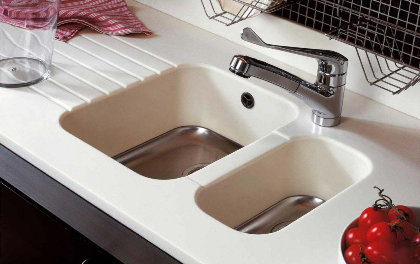 These sinks are made from a special type of fiberglass-reinforced plastic. They are comfortable, smooth, and relatively inexpensive. It is quite easy to care for them, but do not overuse abrasive or oil-based cleaning products. It is also worth protecting the coating from hot dishes.
