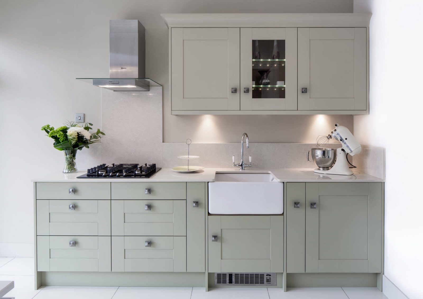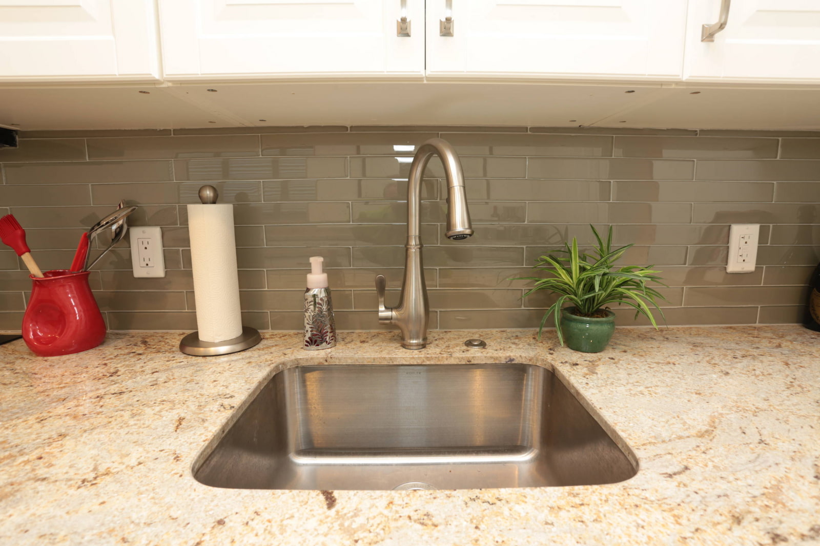 In the photo there is a kitchen with a sink integrated into an artificial stone countertop.