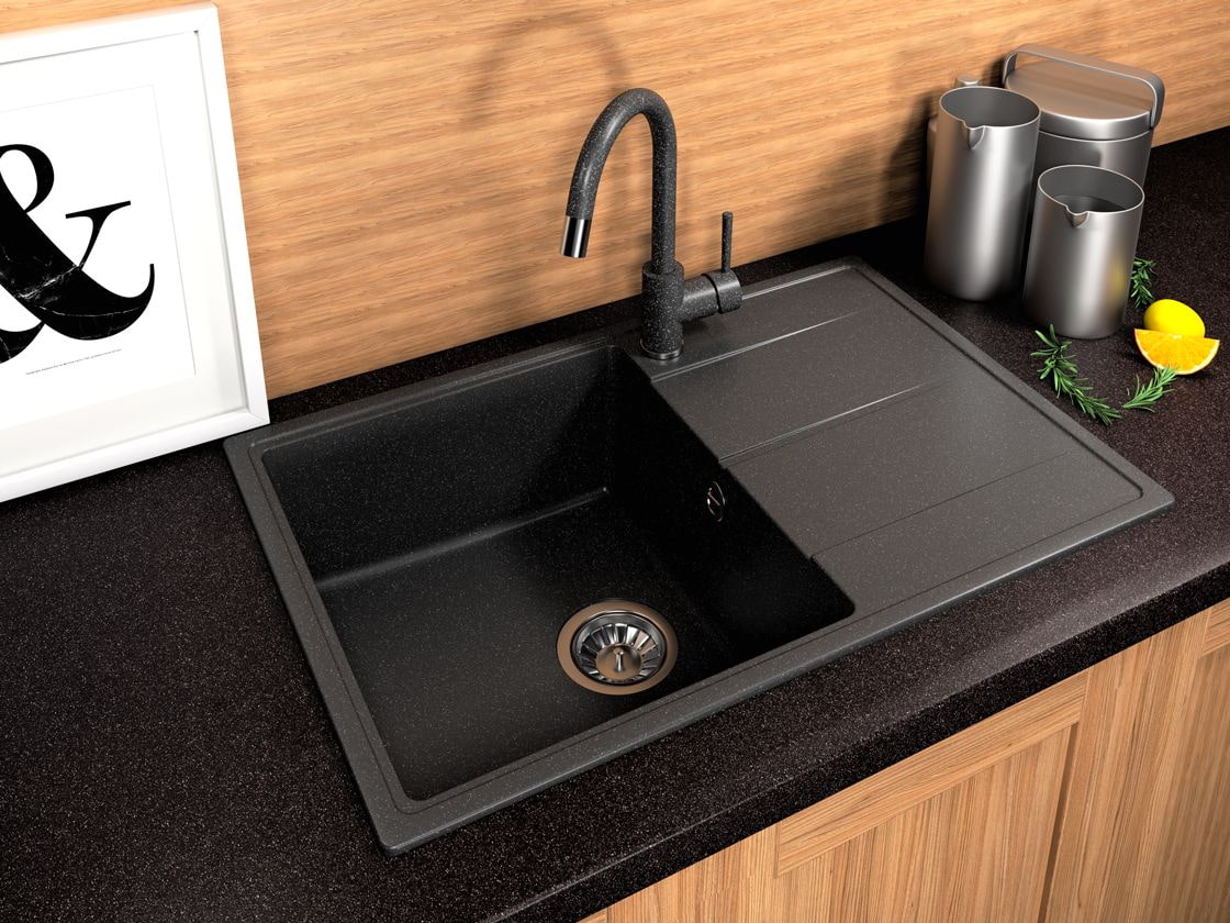 The photo shows a black sink, which looks noble and stylish. On such a surface, it is difficult to see most of the dirt.