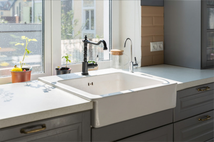 - It is necessary to correlate the design of the plumbing fixture and the style of the kitchen: the "antique" sink will not fit into a loft or high-tech.