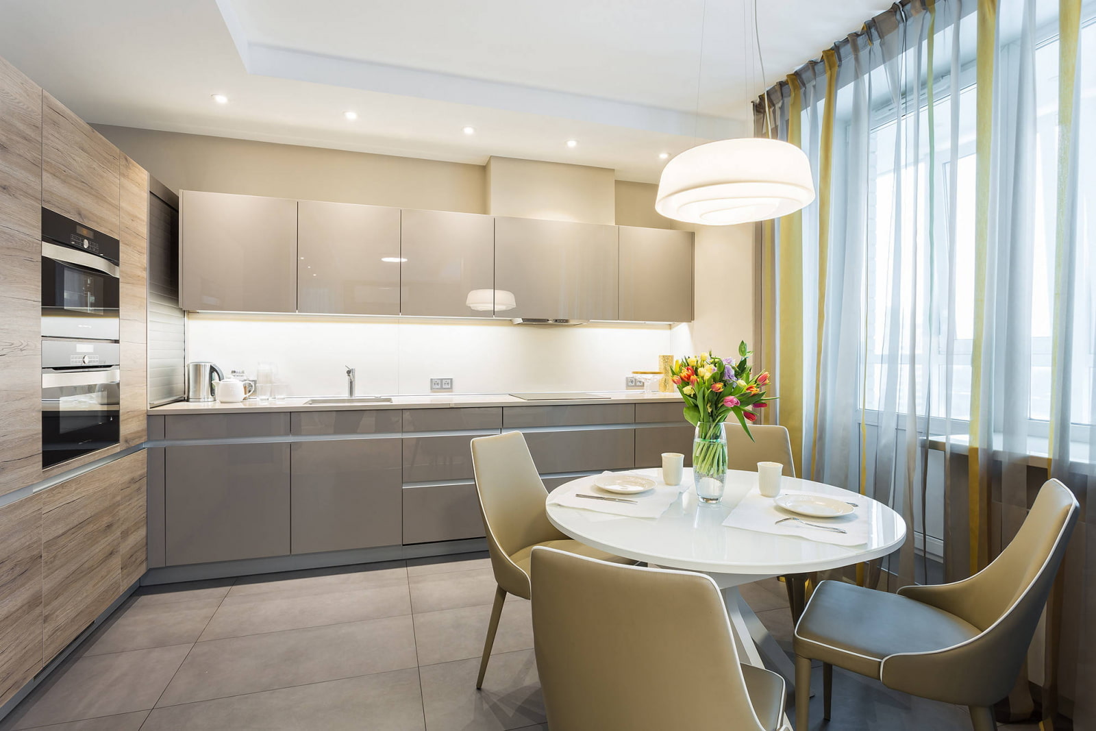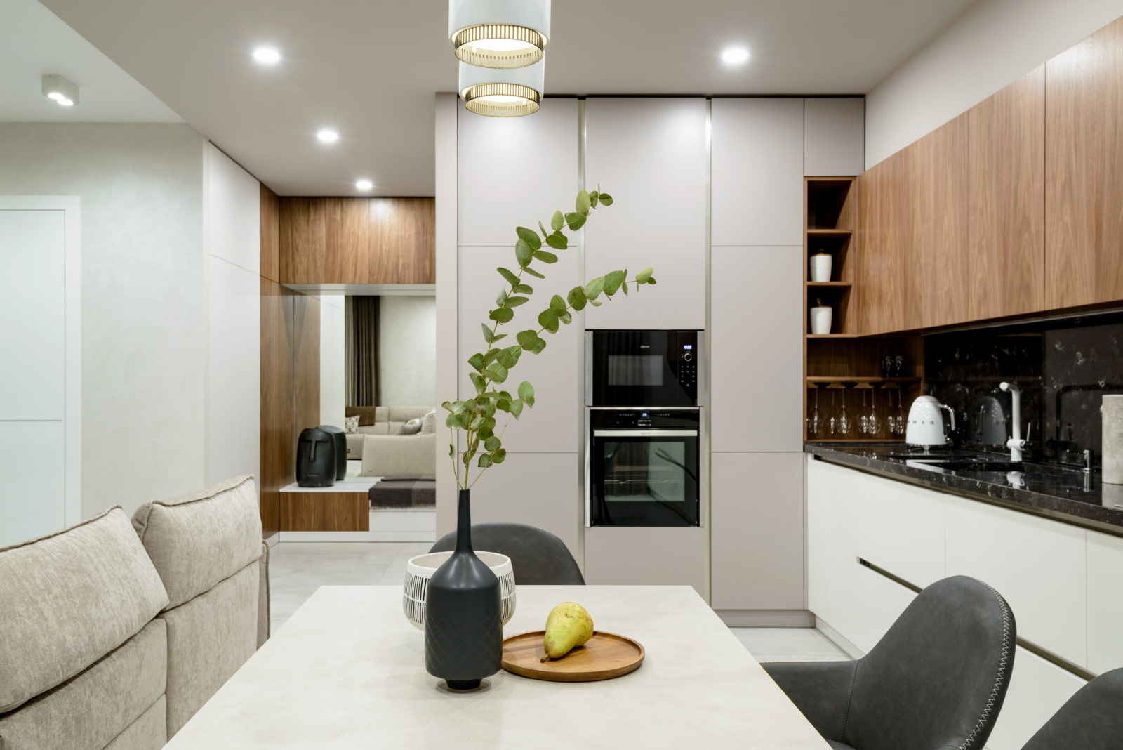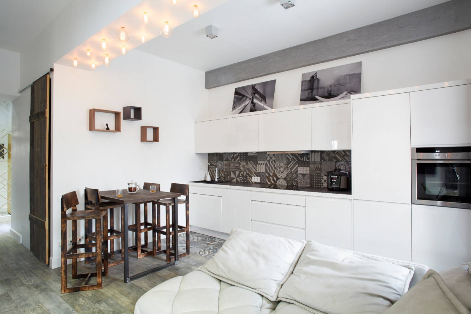 If partitions are not expected in the kitchen-living room or studio apartment, zone lighting will help to separate the room or dining room from the kitchen.