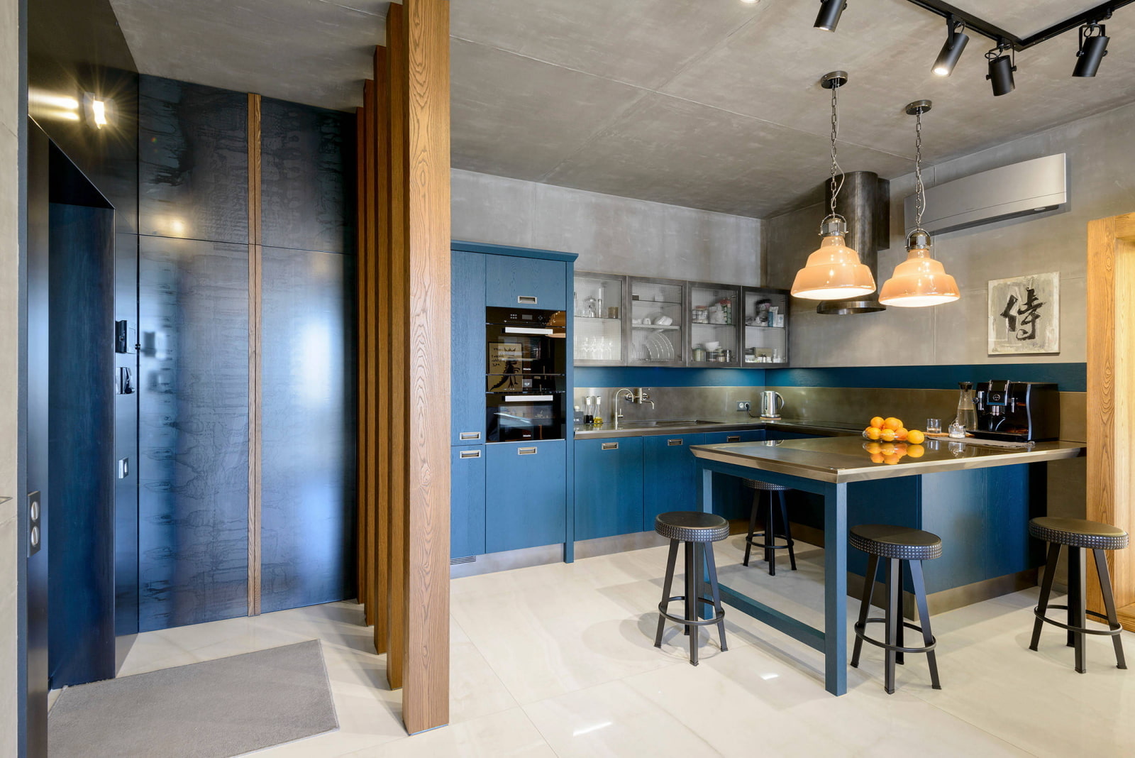 In the photo there is a blue kitchen, the dining area of which is also a working one. It is lit by two pendant lamps.