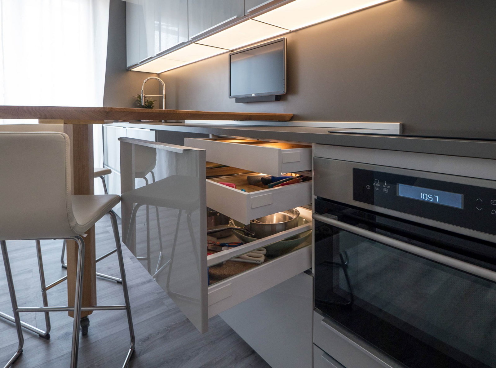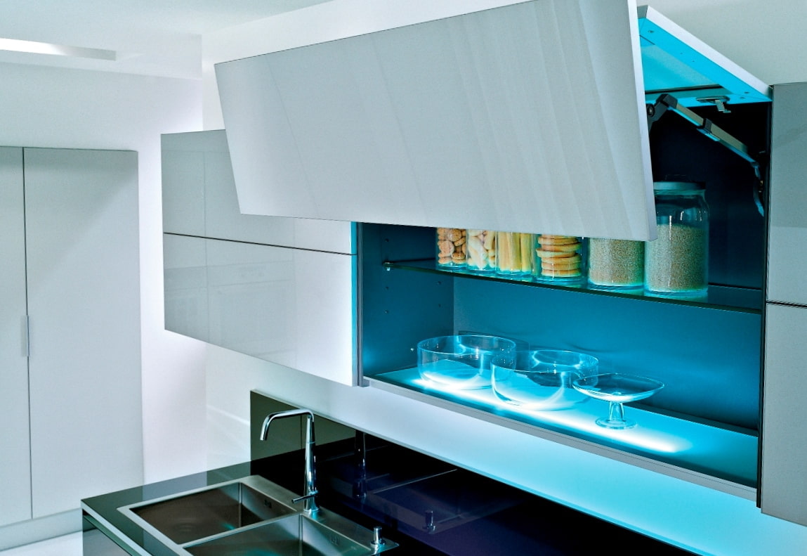 The lighting of closed cabinets is exclusively utilitarian in nature: it does not in any way affect the perception of the kitchen as a whole, unlike the interior lighting of a headset with transparent facades. It is possible to equip cabinets or lower cabinets with lighting both at the stage of ordering furniture, and independently using economical LED strips.