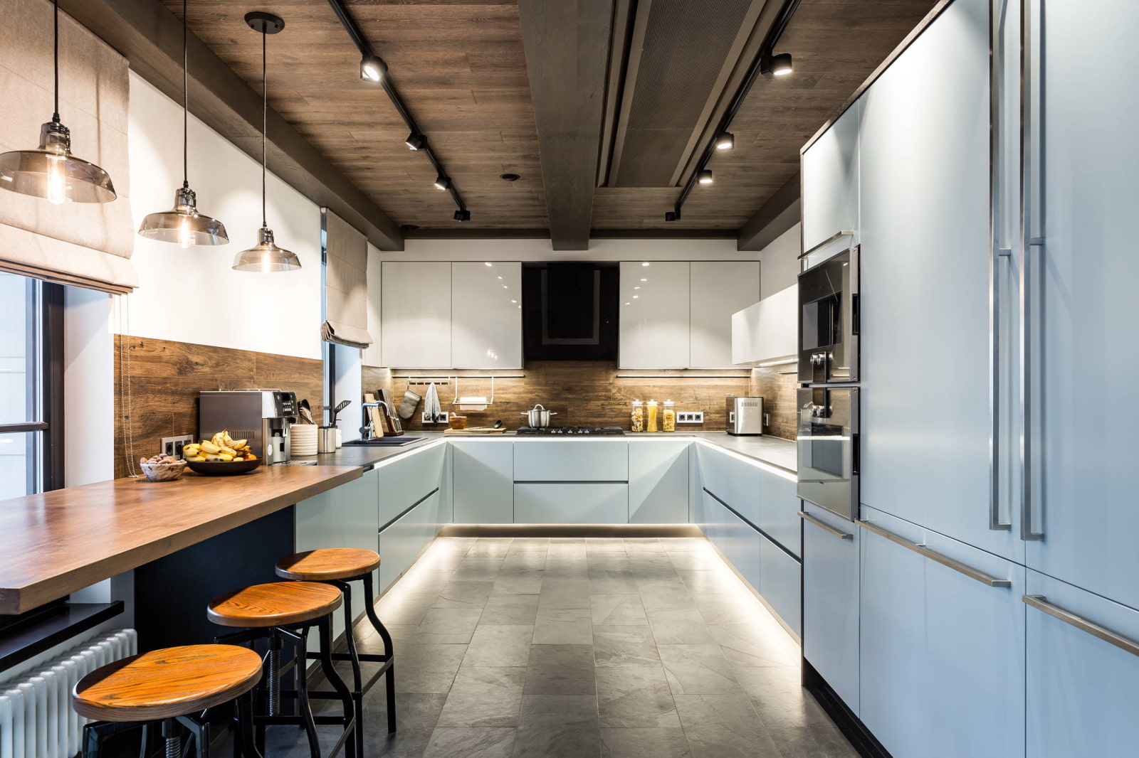 Light sources are also needed above the bar: their purpose is not only lighting, but also zoning the kitchen space. If the kitchen is connected to the living room, then the lamps should be located not only above the dining group of table and chairs, but also next to the seating area - armchairs or a sofa.