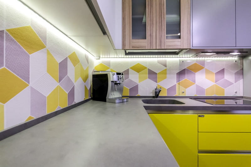 Decorative LED lighting can be placed under the ceiling, on the edge of the podium, or linearly on the wall as an accent. The suite, illuminated from below, visually expands the space of a long narrow kitchen.