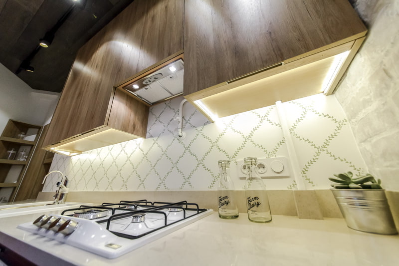 The photo shows a small kitchen with a hanging chandelier, LED strip in the work area and spotlights above the cabinets.