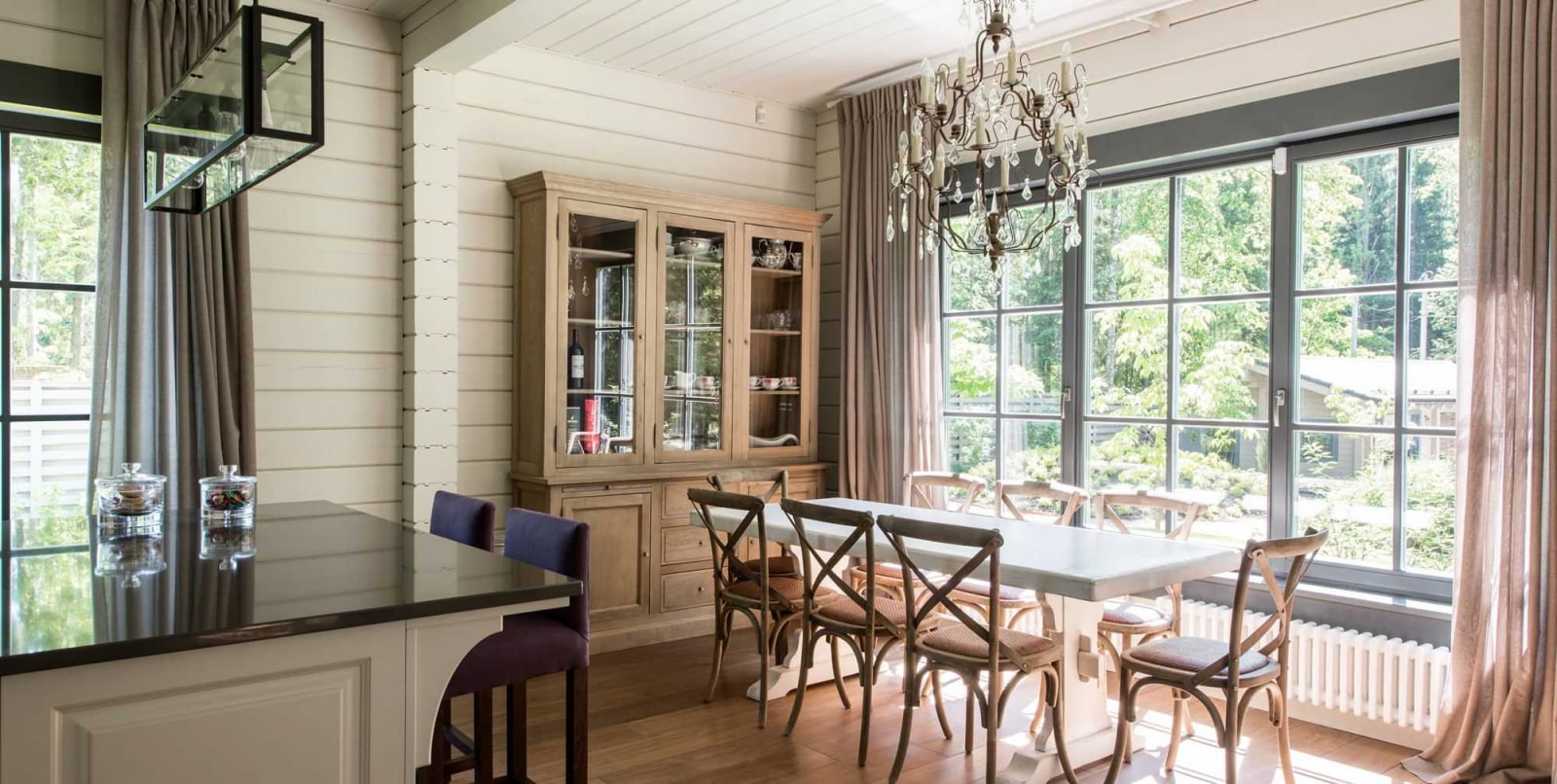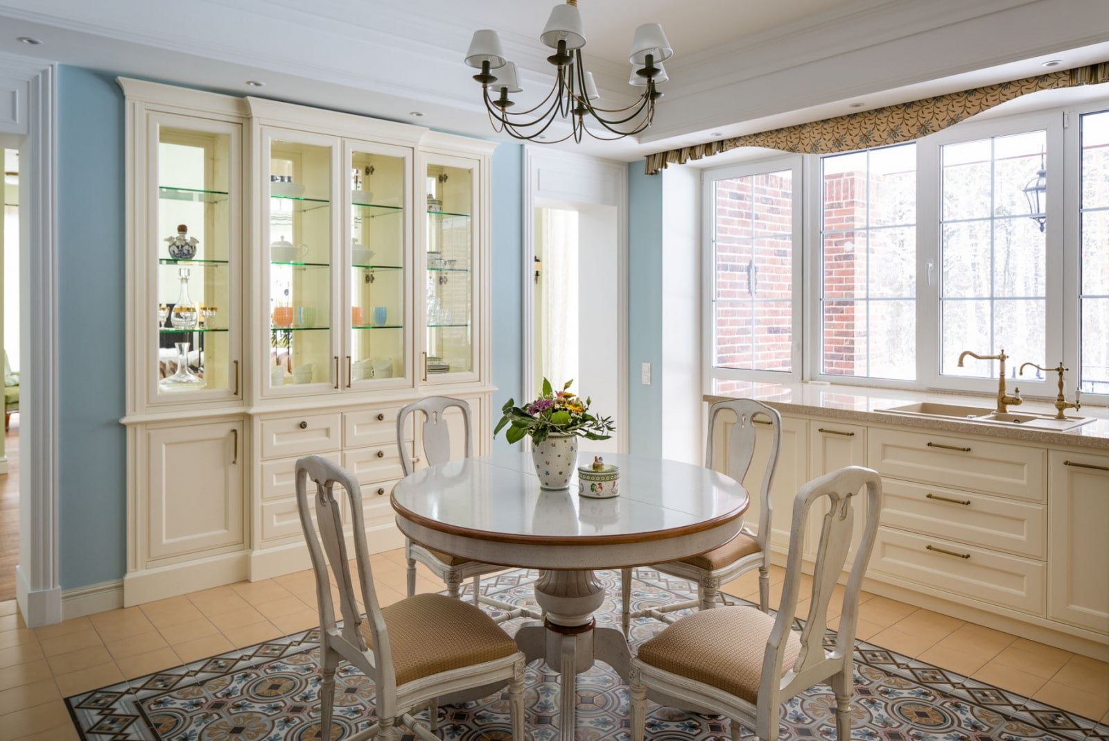Close to kitchen furniture. The dish cabinet, made in the same style as the kitchen set, will be an excellent continuation of the furniture ensemble. A built-in option is possible, when the sideboard is built into a straight or corner set, making it a central part. But in this case, make sure in advance that the height of the countertop is at the same level.