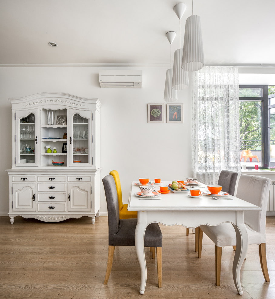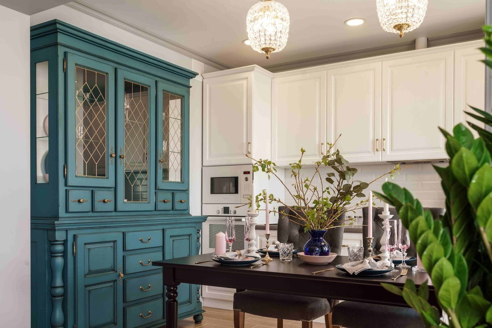 - Eclecticism.When creating a modern design, it is not necessary to choose a laconic laminated sideboard, play on contrast. Putting a vintage cabinet in a trendy, minimalist kitchen is a great way to preserve antique furniture.