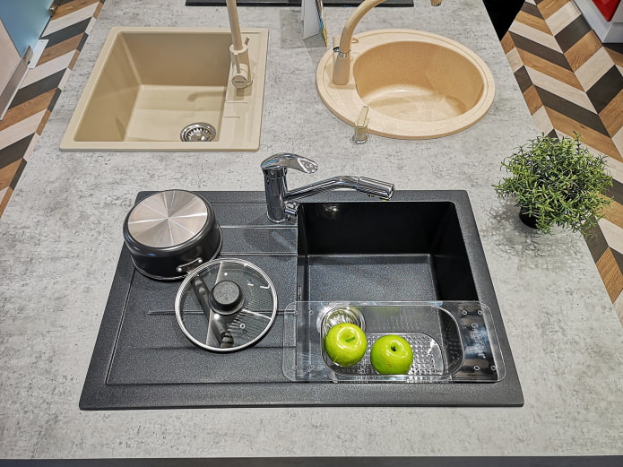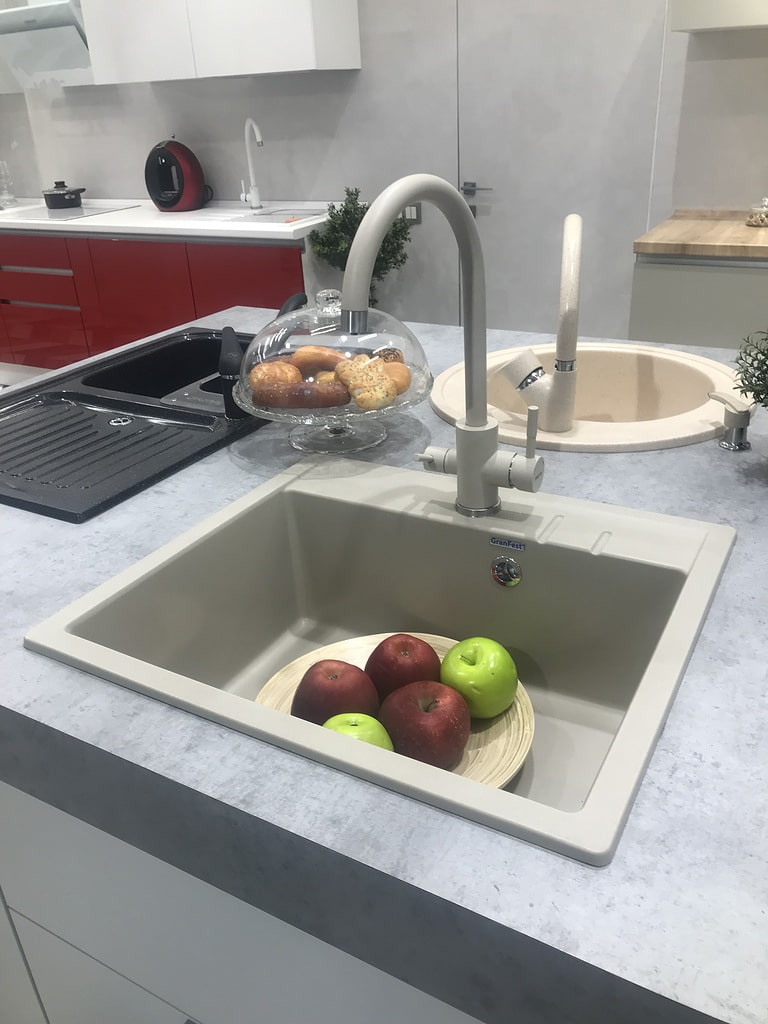 The sink belongs to the final details of the kitchen design. This means that its color and material are chosen last, when the wall decoration and furniture set have already been determined.