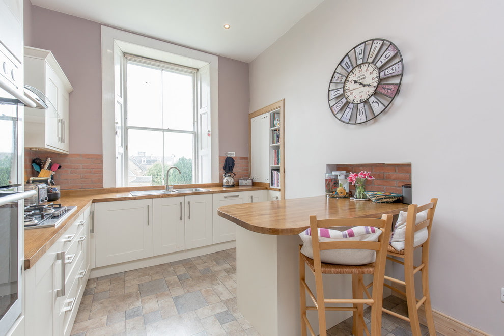 The photo shows the original clock on the wall in the interior of the kitchen, made in light colors.