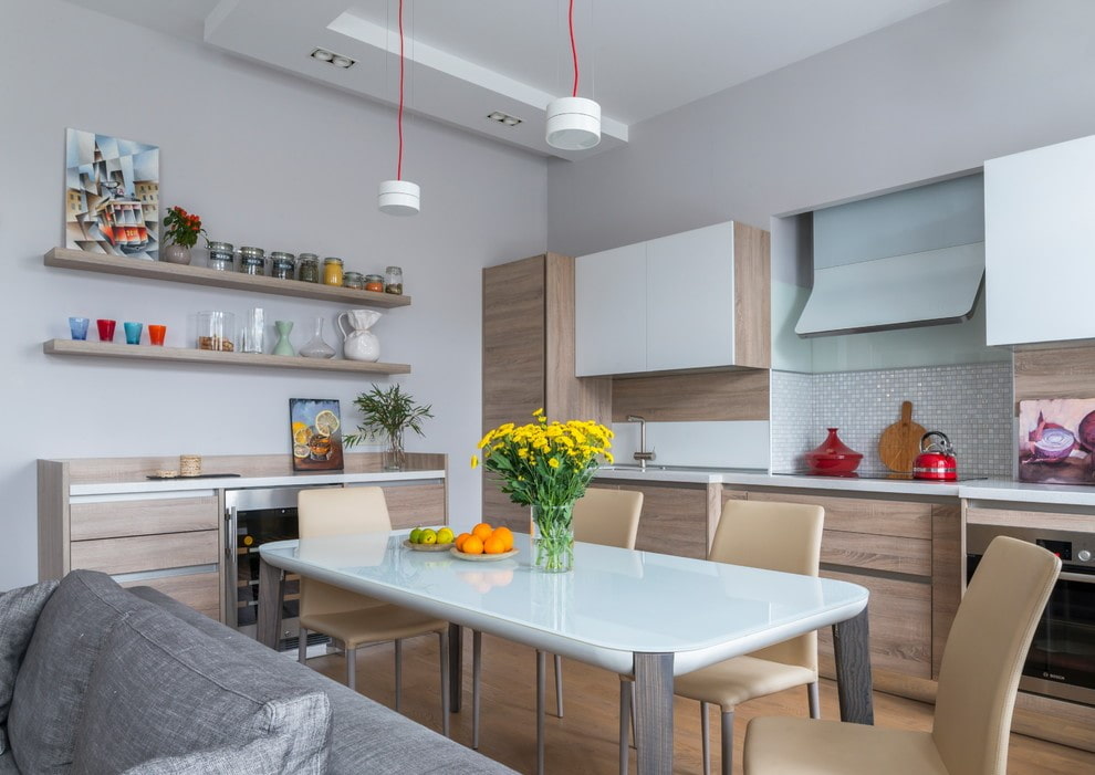 It is supposed to use laconic accessories and decor. Shelves with decor with a strict systematic no-frills, artificial or dry flower arrangements in pots of a strict geometric shape will create a minimal, but at the same time very stylish and modern design.