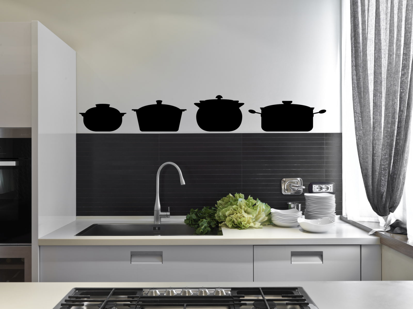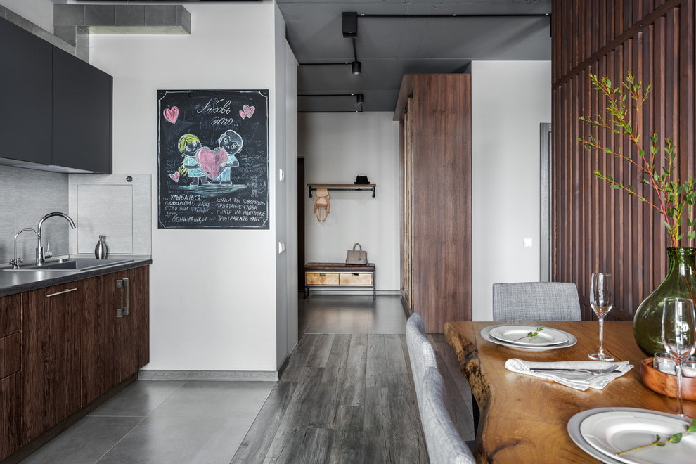 In the photo, the interior of the kitchen and the wall decor in the form of a slate board.