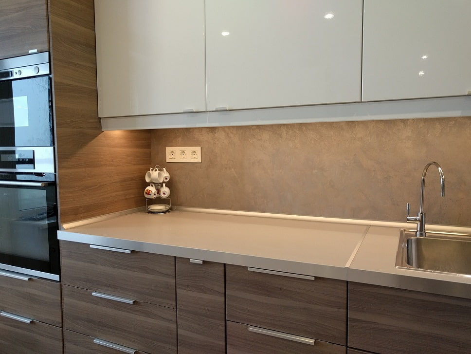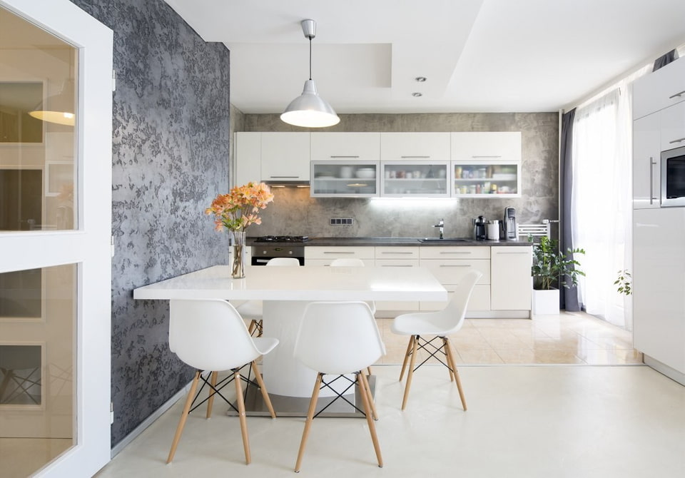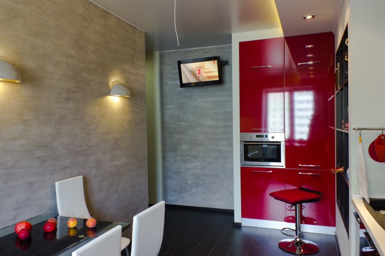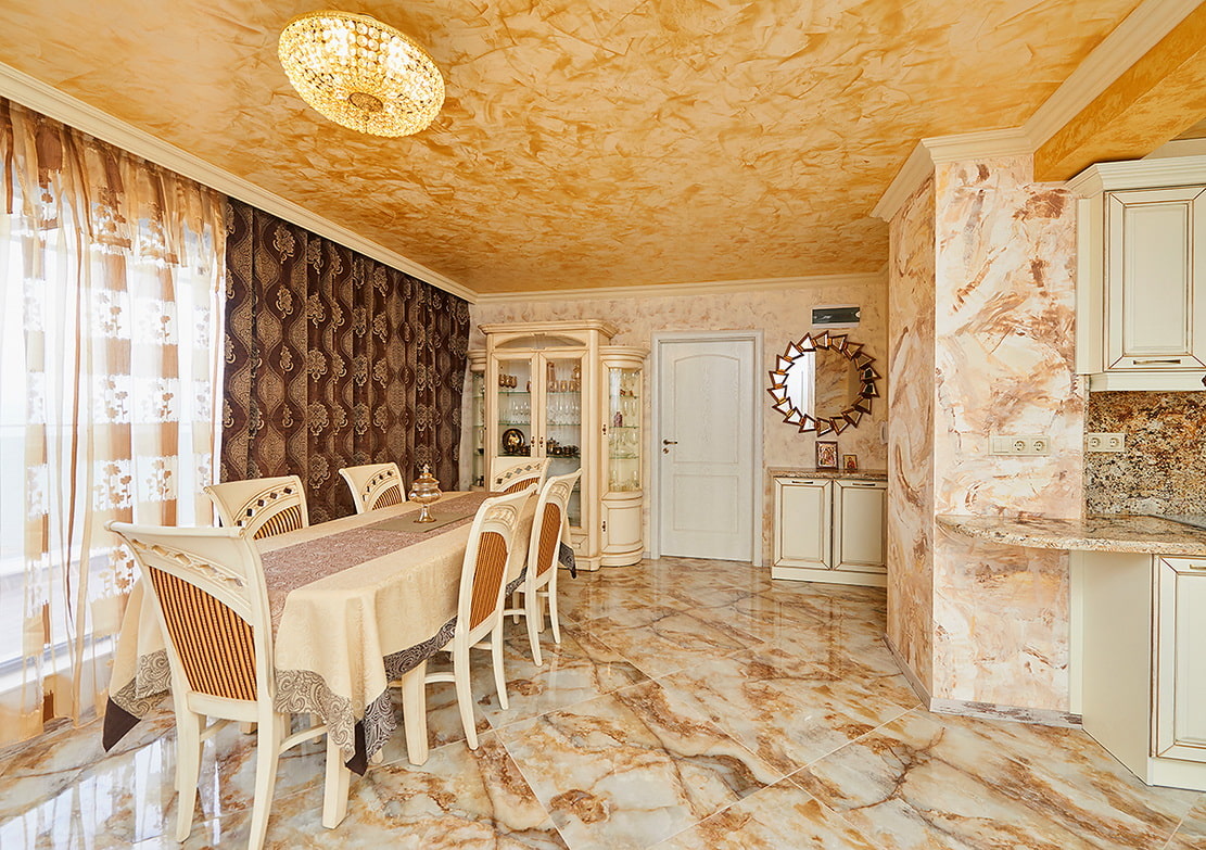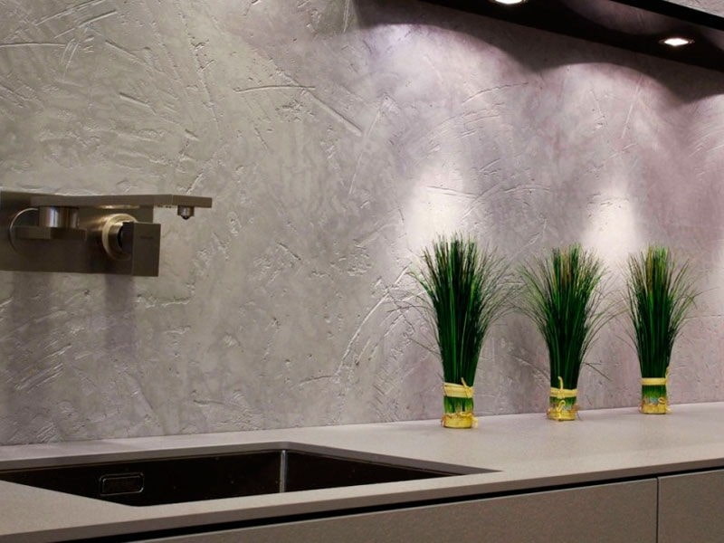 Decorative coatings are also distinguished by the method of application. The kitchen uses Venetian, textured and structural plaster.
